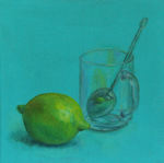 2015Stilleven van Citroen, theeglas en thee-ei.