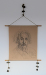 2010Portrettekening en citaat van Einstein op zeildoek. Voorzien van zelfbedacht ophangmechanisme met hout, touw en steentjes.(installatie)